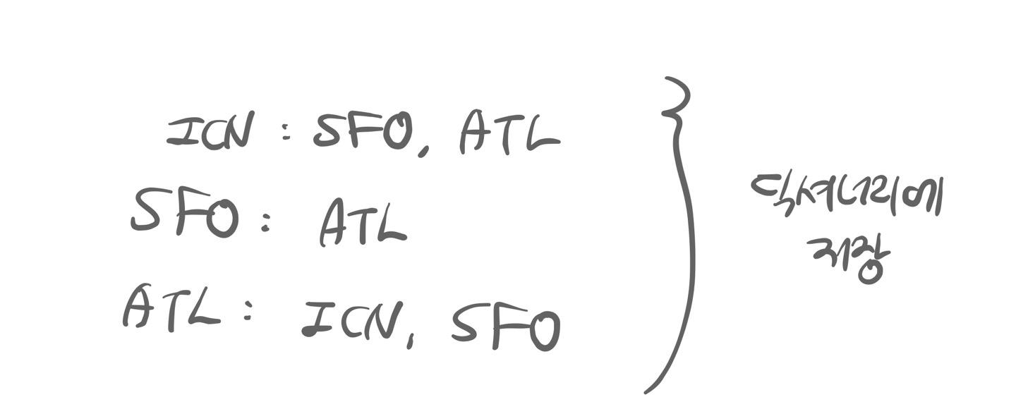 - 딕셔너리에 출발지를 key, 도착지를 value로 하여 저장한다.