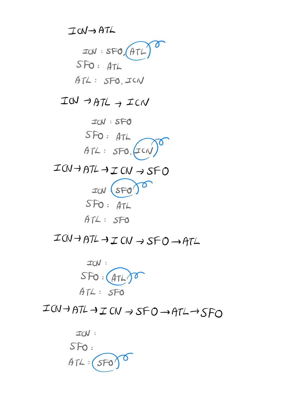[["ICN", "SFO"], ["ICN", "ATL"], ["SFO", "ATL"], ["ATL", "ICN"], ["ATL","SFO"]] ["ICN", "ATL", "ICN", "SFO", "ATL", "SFO"]