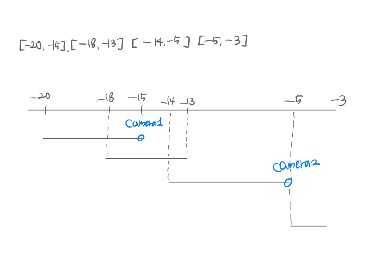 def solution(routes): answer = 1 # 나가는 시간 기준으로 오름차순 정렬 routes.sort(key = lambda x : x[1]) # 처음 카메라 위치는 가장 먼저 차량이 나간 지점 camera = routes[0][1] for i in range(1, len(routes)): # 만약 다음 차량이 출발한 시점보다 카메라가 전에 있으면 if camera < routes[i][0]: # 카메라 개수 하나 증가 answer += 1 # 카메라 위치 다음 차량이 나간 지점으로 이동 camera = routes[i][1] return answer - 예제 routes = [[-20,-15], [-14,-5], [-18,-13], [-5,-3]]의 경우 아래와 같다.